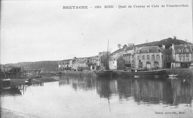 Constructions navales au niveau de la vieille cale, 1er quart 20ème siècle ; remarquer les caboteurs au quai de Courcy (AD 22, Fonds Joël)Immatriculation