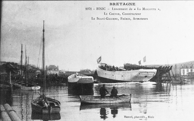 Mise à l'eau de la Mascotte, en 1910, au chantier Le Chevert-Ollivier pour l'armement Le Suavé Galerne (AD 22, Fonds Joël)Immatriculation