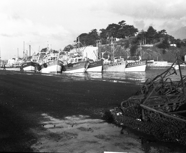 Bateaux coquilliers dans l'avant-port, vers 1970, remarquer les dragues à coquilles à coquilles St-Jacques (AD 22)Immatriculation