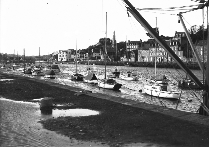 Bateau coquillier dans l'ancien port au milieu des bateaux de plaisance, vers 1970, remarquer les apparaux de pêche, dont le mât de charge avec les dragues à coquilles à coquilles St-Jacques (AD 22)Immatriculation
