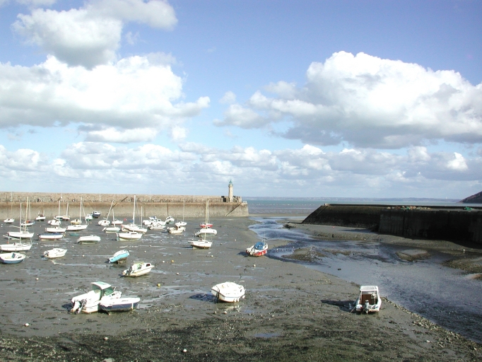 Vue de l'avant-port de Binic à marée basse : les deux jetées se rejoignent en amont, offrant une bonne protectionImmatriculation