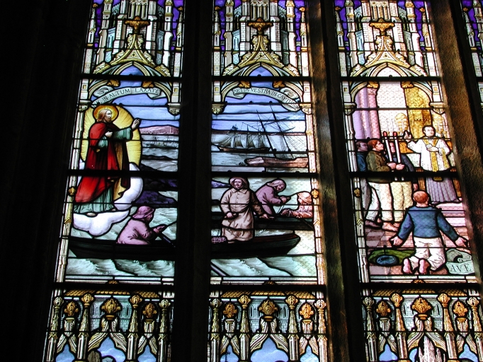 Détail du vitrail de la chapelle Notre-Dame-de-la-Cour en Lantic : scène de pêche à Terre-NeuveImmatriculation