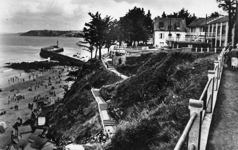 Vue du sentier douanier et de l'escalier en zigzag au-dessus de l'avant-port, vers 1950-60 : remarquer les rambardes blanches, les logements et terrasses du Bon Accueil (collection particulière)Immatriculation