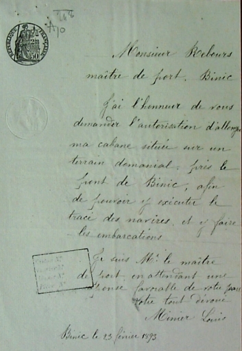 Demande d'autorisation du constructeur Louis Minier de pouvoir tracer le plan de ses navires en allongeant son hangar et de construire une goélette sur la cale de construction, 1889 (AD 22)Immatriculation