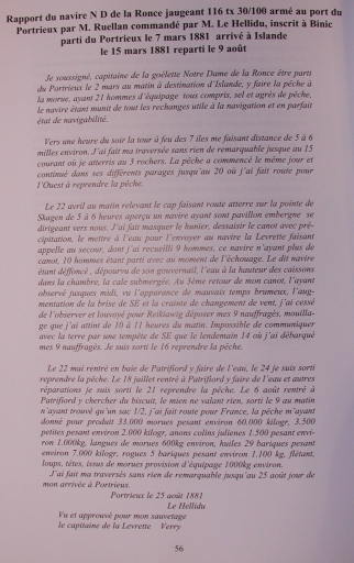 Rapport de mer du navire N.D. de la Ronce armé par Ruellan, commandé par M. Le Hellidu, inscrit à Binic, parti du Portrieux le 7 mars 1881, arrivé à Islande le 15 mars 1881, repari le 9 août (SHM Brest, Atelier du patrimoine)Immatriculation