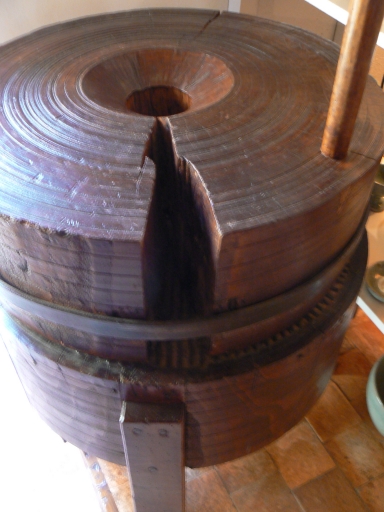 Ancienne meule à bras en bois conservée dans l'ancienne étable devenue salle d'exposition de la poterieImmatriculation