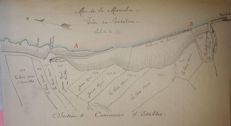 Dessin, plan : plage des Godelins en 1899 ; remarquer les cabines de bains en front de mer, les grottes, les bains chauds, la cabane de douaniers, les terrains constructibles Legris (AD 22)Immatriculation