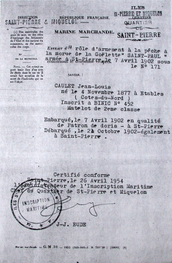 Copie datée de 1954 : extrait du certificat rôle d'armement à la pêche à la morue de la goélette St-Paul à St-Pierre, 1902 (collection particulière)Immatriculation