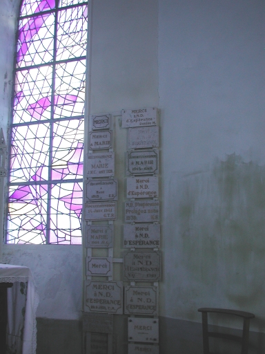 Vue intérieure : remarquer les anciennes plaques de marbre (ex-voto) et le vitrail réalisé par Raoul Michau en 1972Immatriculation