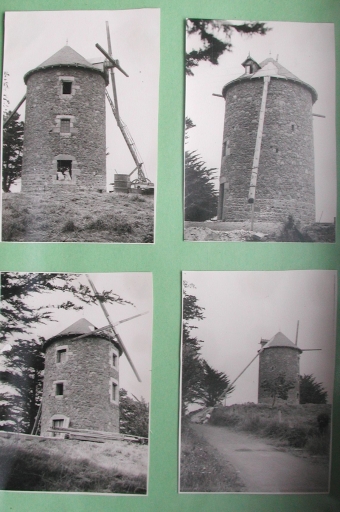 1ère restauration en 1971 : pose des deux scions de chacune des ailes qui traversent l'arbre : remarquer la queue restaurée du moulin (collection particulière, Jean Peillet)Immatriculation