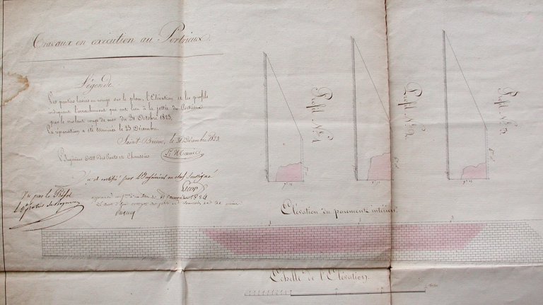 Plan : élévation et profil de la jetée de Portrieux, après la tempête du 25 décembre 1823 (AD 22)Immatriculation