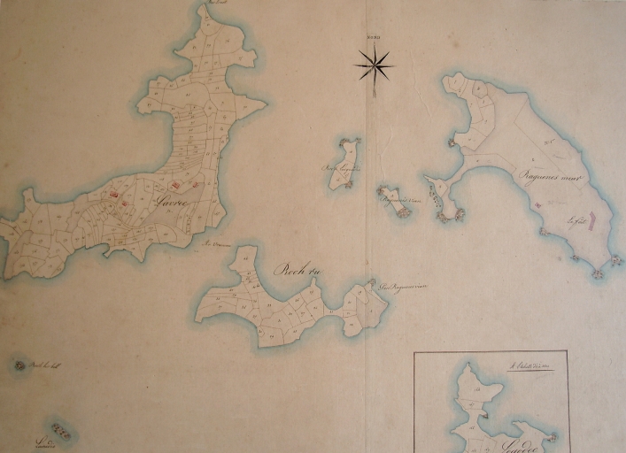 Extrait du cadastre de 1832, section B, 1ère feuille dite du Centre, l'Île Lavrec, l'Île Logodec et l'Île Raguénès (AC Ile-de-Bréhat)Immatriculation