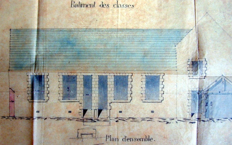 Ancienne école des garçons, bâtiment des classes, dessin par Guiomar, 1885Immatriculation