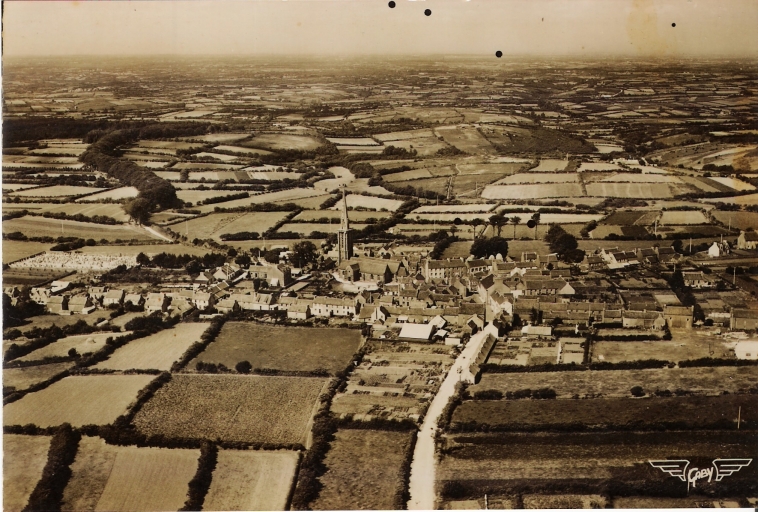 Vue aérienne du bourg, vers le nord. Carte postale, vers 1950 (coll. part.)Immatriculation