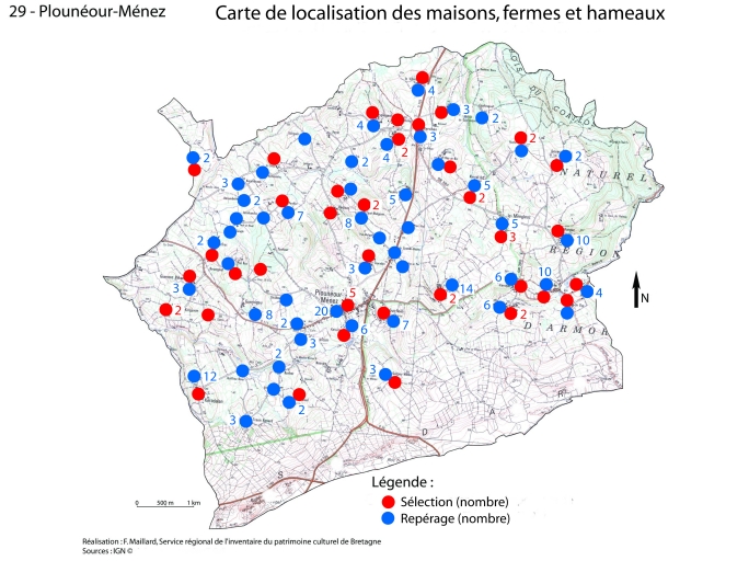 Les maisons, fermes et hameaux sur la commune de Plounéour-Ménez,
