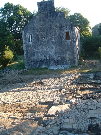 Implantation du bâti du 19e siècle sur les murs de l’ancien réfectoire, vue vers l’est, en cours de fouilles, 2003. Cl. R. Pérennec, Conseil départemental du Finistère-Mission archéologieImmatriculation