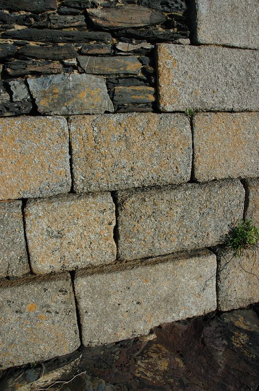 Vue de la batterie de Cornouaille : mur de soutènement de la batterie. Soubassement, chaînes, cordon, gargouilles et encadrement des créneaux en granite, remplissage en moellons de schisteImmatriculation