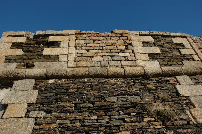 Vue de la batterie de Cornouaille : mur de soutènement de la batterie. Soubassement, chaînes, cordon, gargouilles et encadrement des créneaux en granite, remplissage en moellons de schisteImmatriculation
