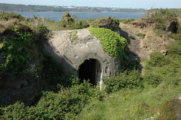Roscanvel, pointe de Kerviniou : batterie de 4 canons de 24 cm de Kerviniou, entrée, escalier d'accès du magasin à poudre sous rocImmatriculation