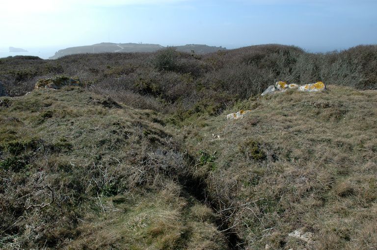 Vue du terrain situé à l'ouest du corps de garde de Penhoat : supports bétonnés pour canons antiaériensImmatriculation