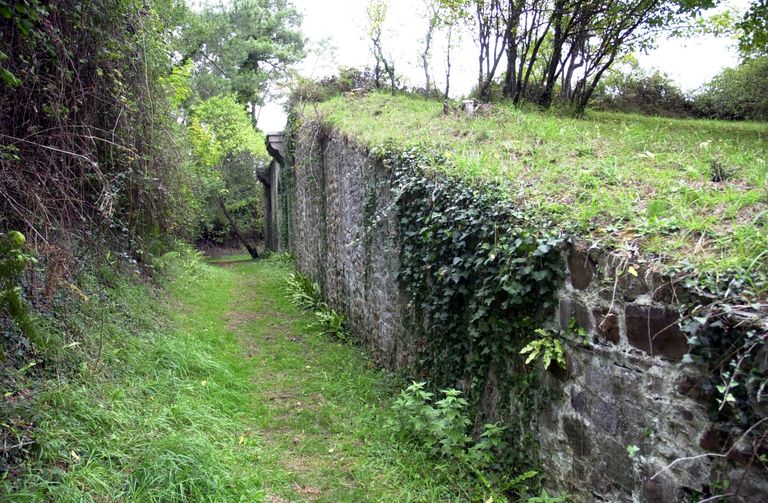 Vue du corps de garde crénélé n° 2 modifié de la pointe de Morgat ou Kador : masque terrassé couvrant le long pan est et le pignon sud. Masque artificiel réalisé avec le déblai provenant de la fouilleImmatriculation
