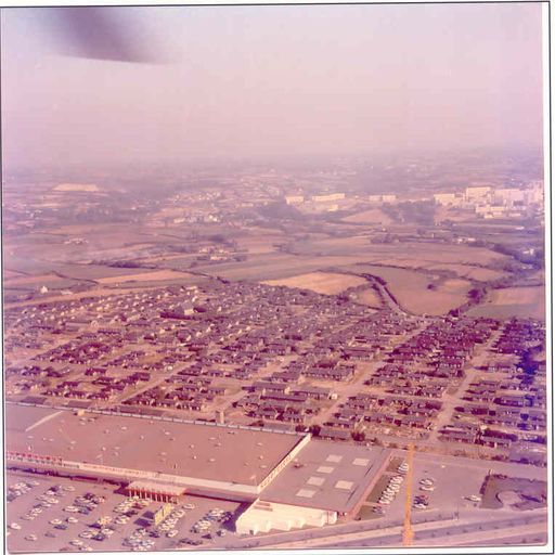 Vue aérienne oblique des baraques du Point-du-Jour en 1972. Au premier plan, l'hypermarché Super-Ouest inauguré en 1969Immatriculation