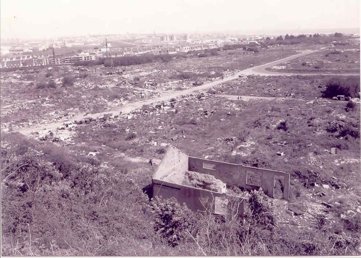 Vue de l'emplacement des baraques du Polygone-butte depuis le sommet de la butte du Polygone, vers 1980Immatriculation