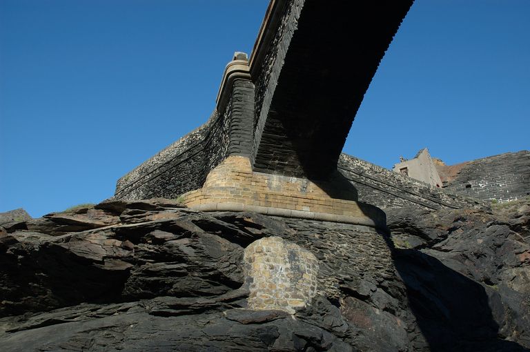 Vue du pont à une seule arche en appareil de schiste renforcé par une maçonnerie en grès de l'îlot des Capucins. Il porte au sud la date de 1861 et les lettres G M pour Génie MaritimeImmatriculation