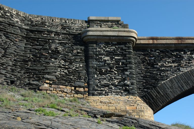 Vue du pont à une seule arche en appareil de schiste renforcé par une maçonnerie en grès de l'îlot des Capucins. Il porte au sud la date de 1861 et les lettres G M pour Génie MaritimeImmatriculation