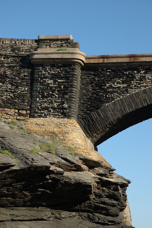 Vue du pont à une seule arche en appareil de schiste renforcé par une maçonnerie en grès de l'îlot des Capucins. Il porte au sud la date de 1861 et les lettres G M pour Génie MaritimeImmatriculation