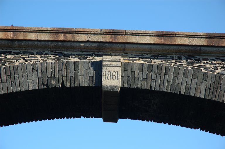 Vue du pont à une seule arche en appareil de schiste renforcé par une maçonnerie en grès de l'îlot des Capucins. Il porte au sud la date de 1861 et les lettres G M pour Génie MaritimeImmatriculation