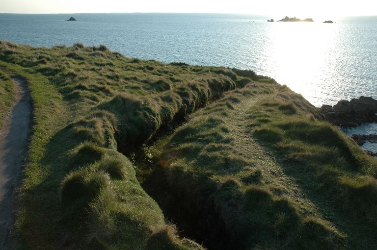 Vue de l'ensemble fortifié allemand de Porz Tévigné : vestiges d'une tranchéeImmatriculation