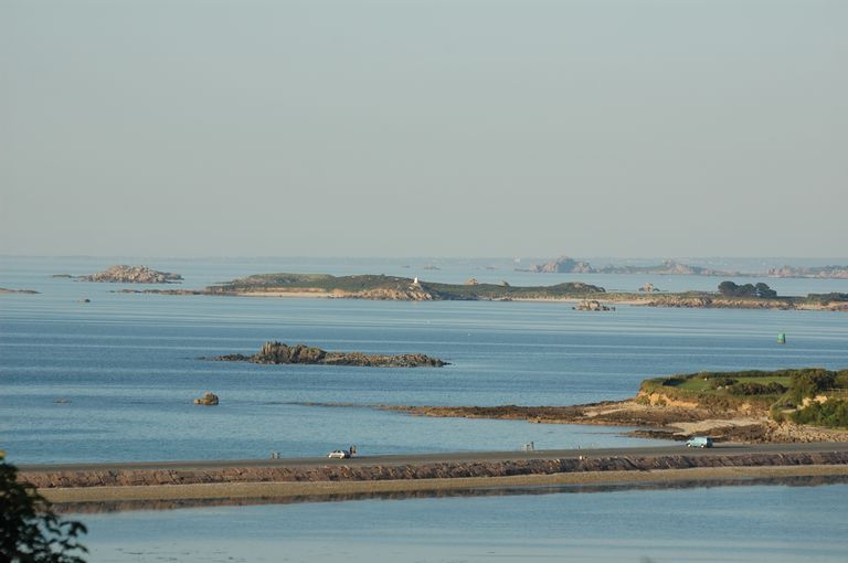 Vue de la chaussée de l'îlot Saint-Anne depuis le Champ de la Rive. En arrière plan : l'île Callot à Carantec et la pointe de Primel à PlougasnouImmatriculation