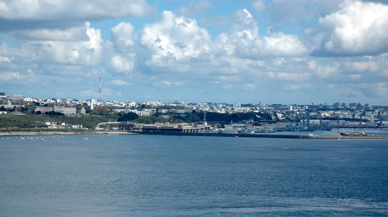 Vue d'ensemble de la ville de Brest depuis la pointe des Espagnols à Roscanvel : la rade abri de l'arsenal et la base de sous-marinsImmatriculation