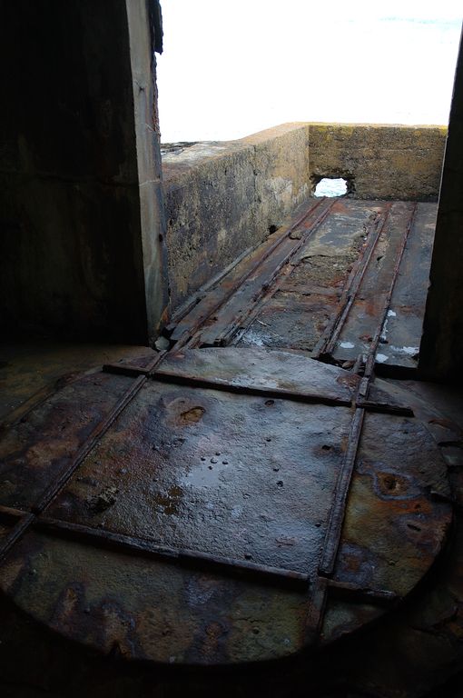 Roscanvel, pointe Robert : abri du groupe de deux projecteurs (60 cm et 90 cm de diamètre), plaque de translationImmatriculation