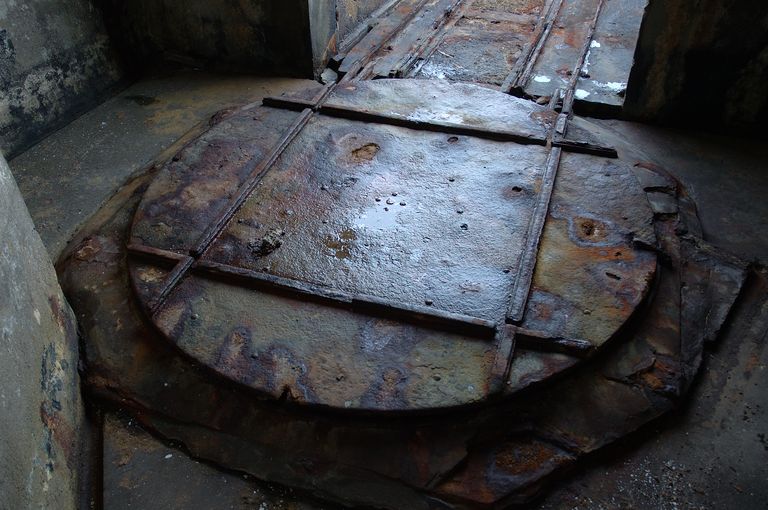 Roscanvel, pointe Robert : abri du groupe de deux projecteurs (60 cm et 90 cm de diamètre), plaque de translationImmatriculation