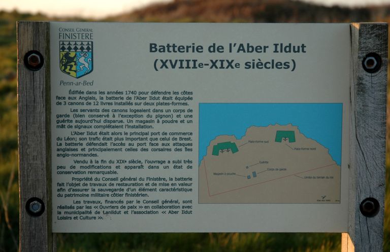 Vue de l'ensemble fortifié de Lanildut : signalétique en place sur la Batterie de l'Aber IldutImmatriculation