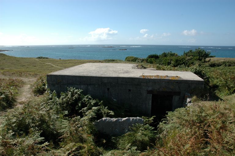 Vue de l'ensemble fortifié de Penn Enez : poste d'observation bétonné avec dalle de couverture en acier (ferraillé)Immatriculation