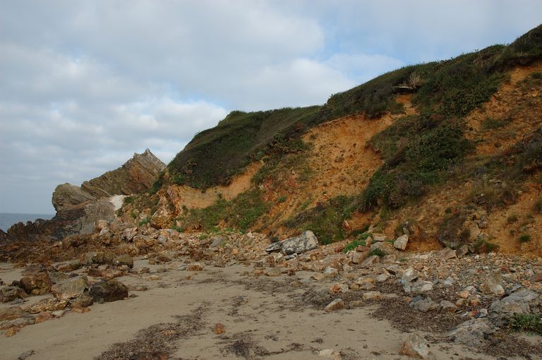 Vue des vestiges de la batterie nord de la Plage de Trez-Rouz. Maçonnerie en blocs de schiste et granite assemblés au mortierImmatriculation