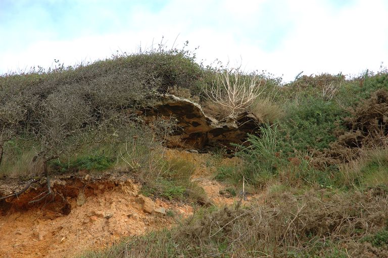 Vue des vestiges de la batterie nord de la Plage de Trez-Rouz. Maçonnerie en blocs de schiste et granite assemblés au mortierImmatriculation