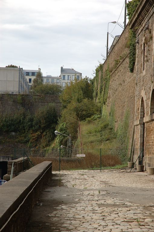 Vue de la rampe menant au plateau de Pontaniou. Au premier plan, de l'élévation orientale (contre-plongée) : la chaussée - terrasse pavée et le passage sud au niveau du rez-de-chausséeImmatriculation