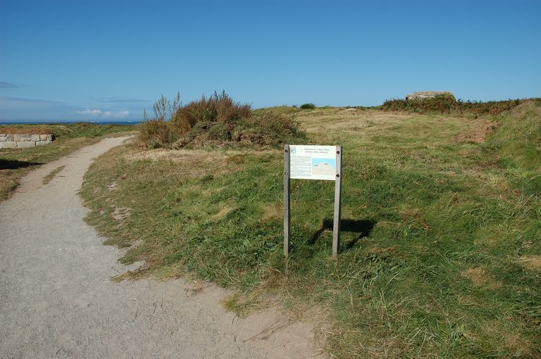 Vue de l'ensemble fortifié de Lanildut : signalétique en place sur la Batterie de l'Aber IldutImmatriculation