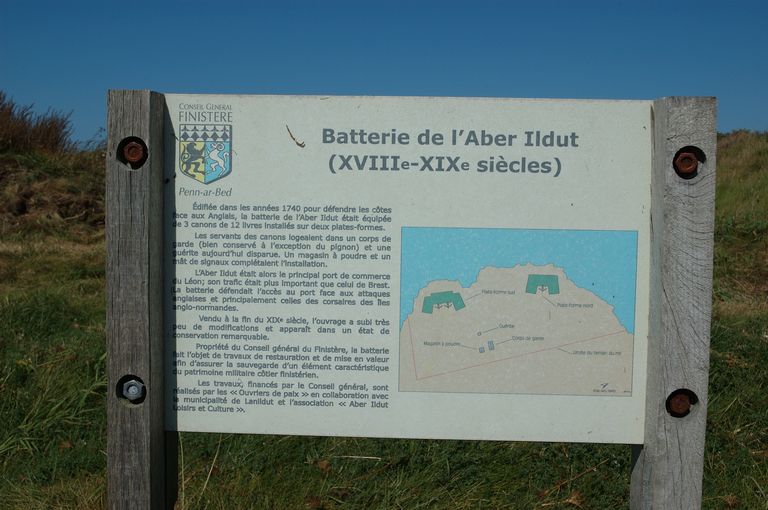 Vue de l'ensemble fortifié de Lanildut : signalétique en place sur la Batterie de l'Aber IldutImmatriculation