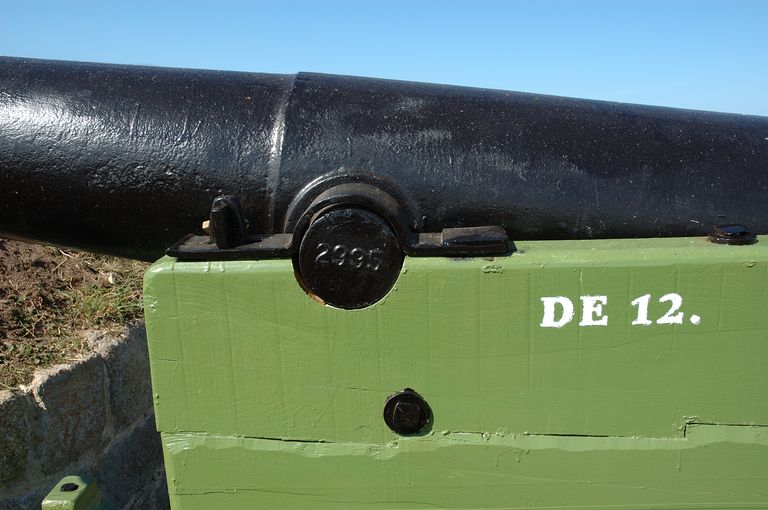 Vue de l'ensemble fortifié de Lanildut : reconstitution et mise en situation d'une pièce d'artillerie sur affût de la 2e moitié du 18e siècle (pièce de marine de 12 livres modèle 1786 de 1 610 kilogrammes coulée en 2007)Immatriculation