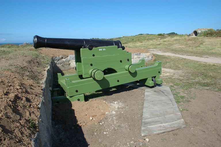 Vue de l'ensemble fortifié de Lanildut : reconstitution et mise en situation d'une pièce d'artillerie sur affût de la 2e moitié du 18e siècle (pièce de marine de 12 livres modèle 1786 de 1 610 kilogrammes coulée en 2007)Immatriculation