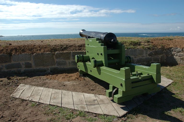 Vue de l'ensemble fortifié de Lanildut : reconstitution et mise en situation d'une pièce d'artillerie sur affût de la 2e moitié du 18e siècle (pièce de marine de 12 livres modèle 1786 de 1 610 kilogrammes coulée en 2007)Immatriculation