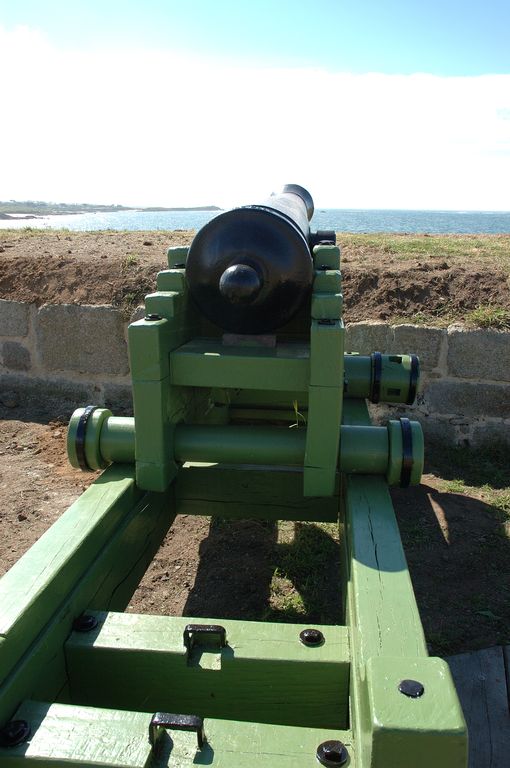 Vue de l'ensemble fortifié de Lanildut : reconstitution et mise en situation d'une pièce d'artillerie sur affût de la 2e moitié du 18e siècle (pièce de marine de 12 livres modèle 1786 de 1 610 kilogrammes coulée en 2007)Immatriculation