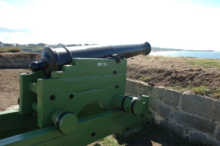 Vue de l'ensemble fortifié de Lanildut : reconstitution et mise en situation d'une pièce d'artillerie sur affût de la 2e moitié du 18e siècle (pièce de marine de 12 livres modèle 1786 de 1 610 kilogrammes coulée en 2007)Immatriculation