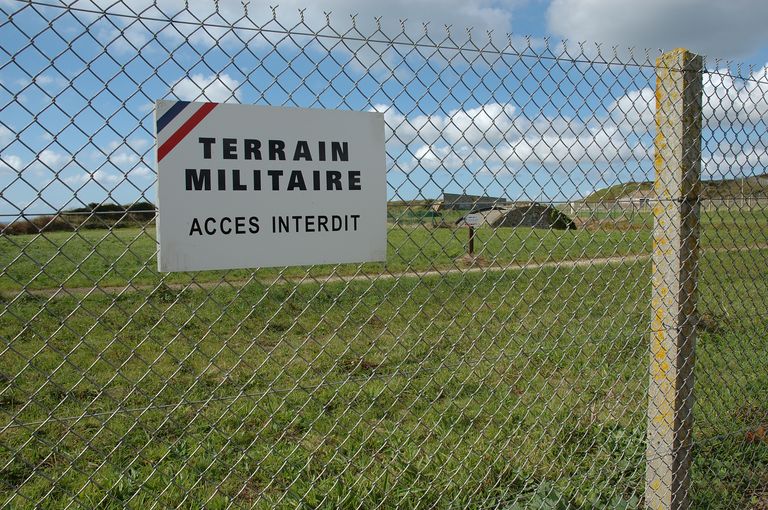 Vue de la clôture délimitant l'emprise militaire : signalétique en place (état en 2007)Immatriculation