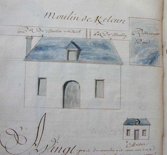 Moulin de Kerelcun. Dessin à la plume aquarellé, 1731 (A. D. Finistère, 41 H 5)Immatriculation